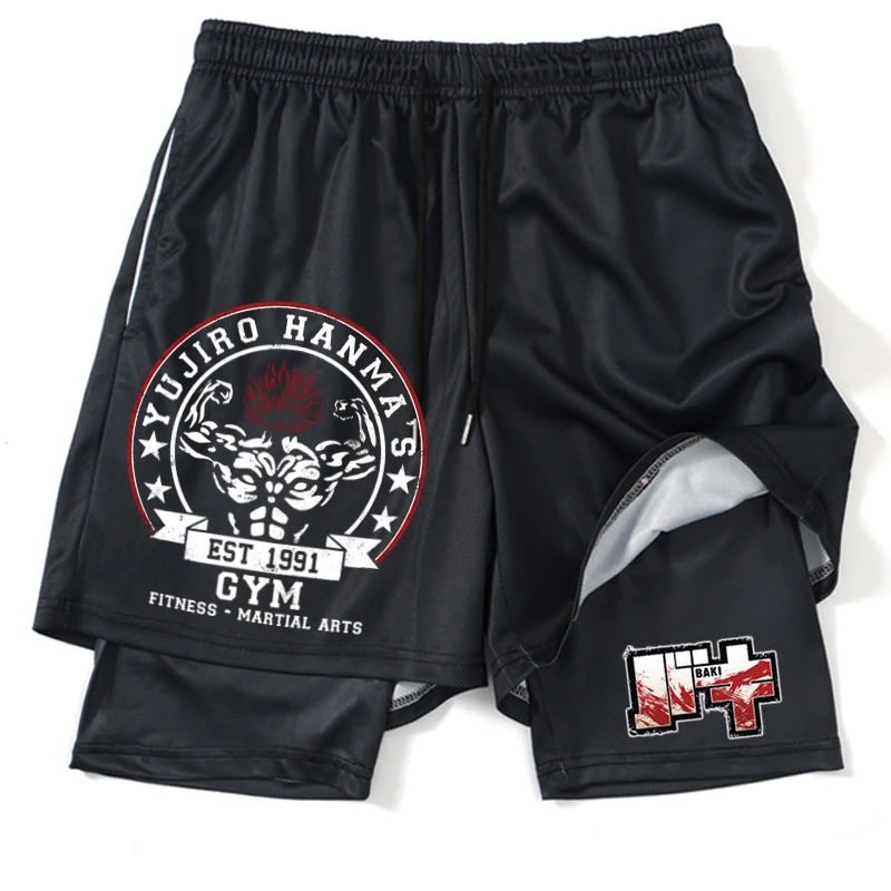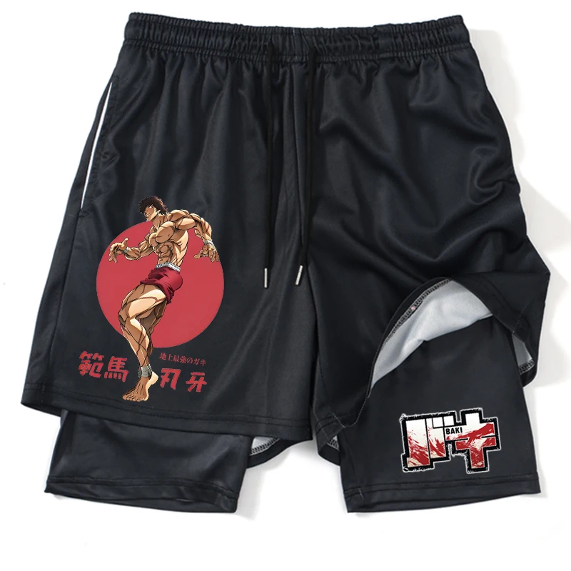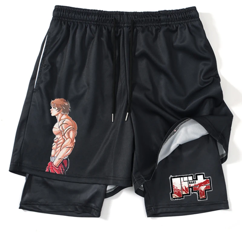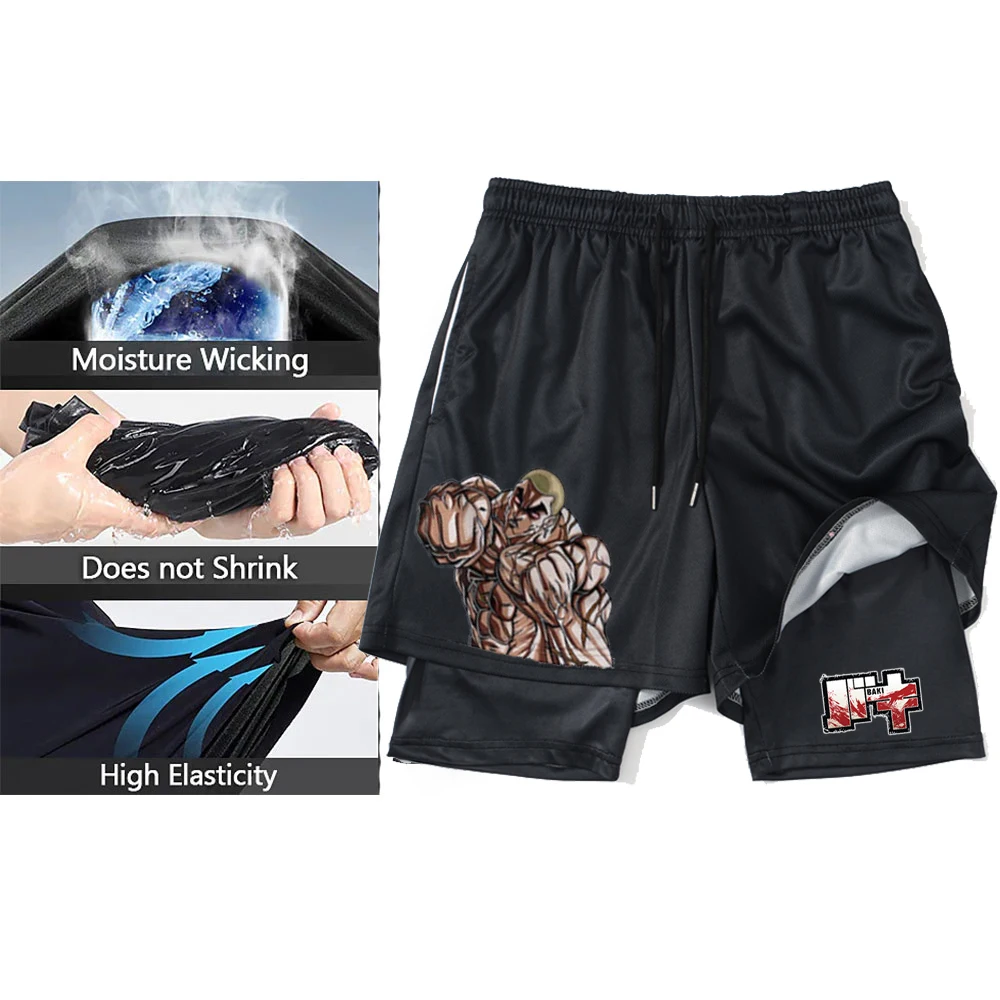 2 In1 Gym Shorts Hanma Baki Anime Shorts Black for Men Women Bodybuilding Fitness Summer Mesh Quick Dry Board Shorts to Beach